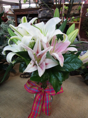 This bouquet is a clear glass vase filled with fragrant lilies.