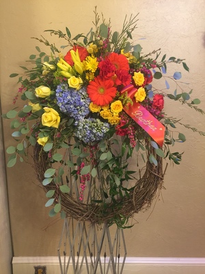 This beautiful wreath is designed as though you walked through a garden and collected a bouquet and placed it on a grapevine wreath.