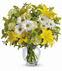 Let the sunshine in with this bevy of bright blooms – yellow lilies, green carnations and other sunny favorites beautifully arranged in a classic ginger jar. Perfect for birthday, get well, thank you – or just to say "Hi!"